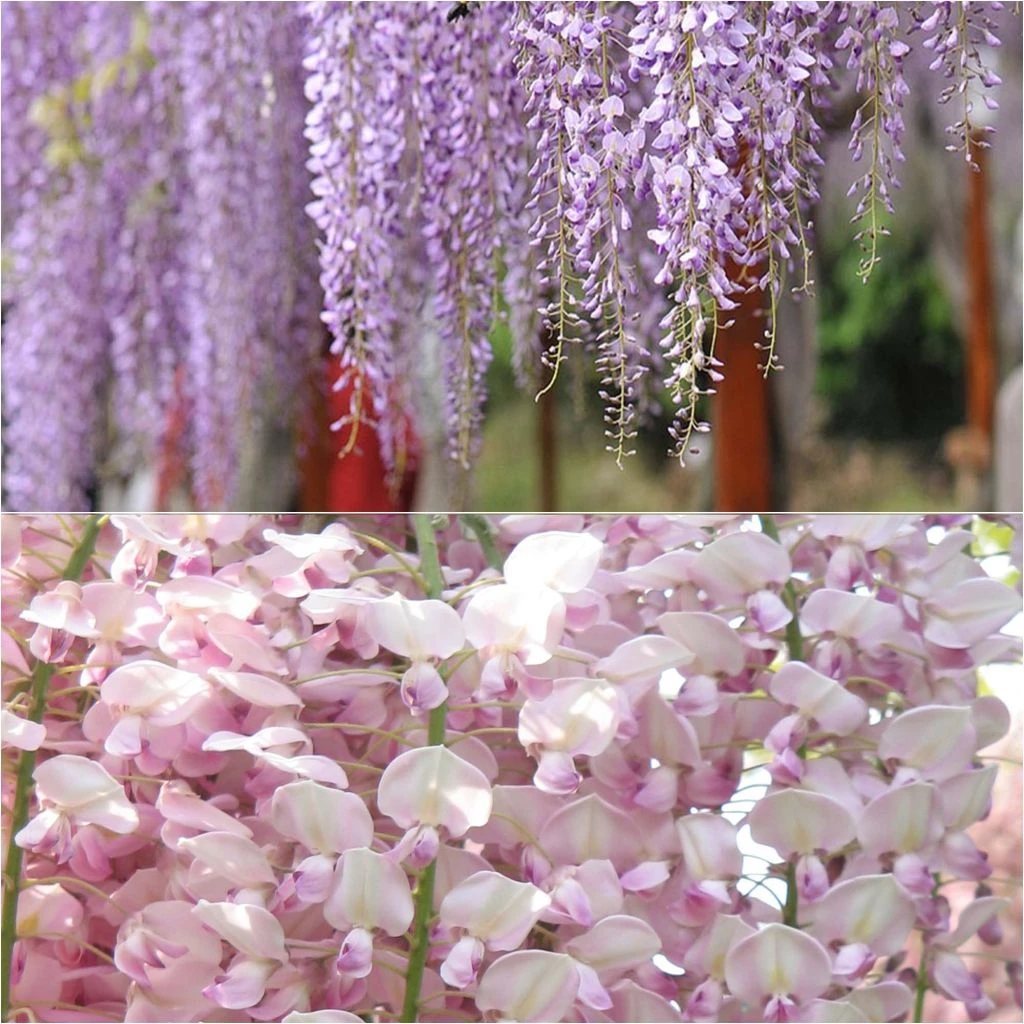Un merveilleux duo de Glycines du Japon, si bien nommées glycines gracieuses. Il réunit deux jolies formes de la Wisteria venusta, moins imposante que sa cousine la Glycine de Chine : la première à fleurs rose pâle, et l’autre à fleurs d’un mauve-bleuté. Leurs grappes plus courtes, aux tons pastel parfaitement assortis, se mêlent dans un léger parfum fleuri, au printemps sur des rameaux à peine feuillés, puis parfois à nouveau en fin d’été, noyées dans le feuillage. Les glycines enroulent spontanément et avec volupté leurs longues tiges volubiles autour des grilles, grillages, tonnelles et pergola. Celles-ci, mieux adaptées aux petits jardins, peuvent également s’installer dans un grand bac sur la terrasse.