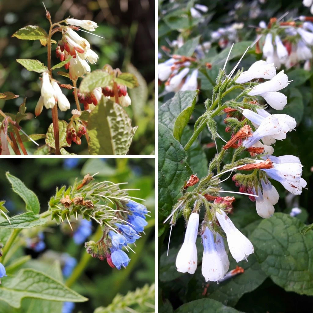 1 x Symphytum grandiflorum ‘Hidcote Blue’ : Offrant des fleurs bicolores bleu ciel et blanc et un feuillage caduc, cette variété s’épanouit à mi-ombre. Elle fleurit en juin-juillet.