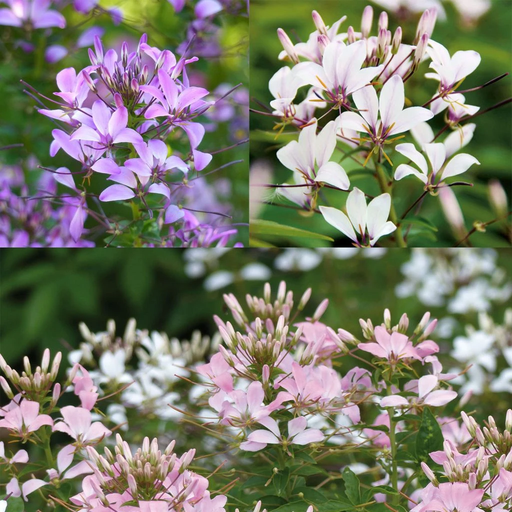 Collection de 3 Cléomes Senorita, rose, rose pâle et blanche pour massifs romantiques.