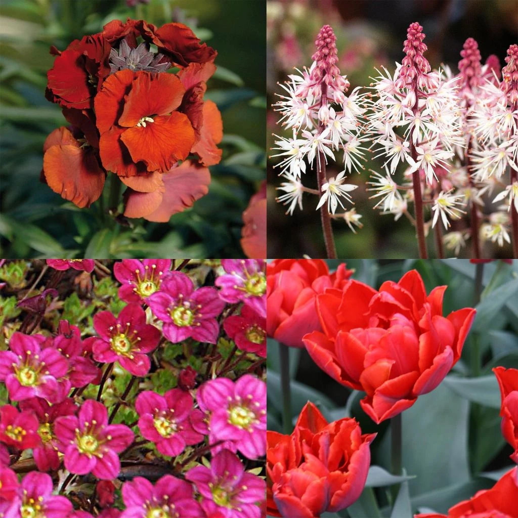 Collection de 3 plants de bisannuelles en mini-mottes, 6 bulbes de tulipes doubles ‘Red Princess’ et 1 saxifrage mousse en godet pour composer une jardinière fleurie au printemps dans des couleurs chaudes, avec un accent décidément moderne.