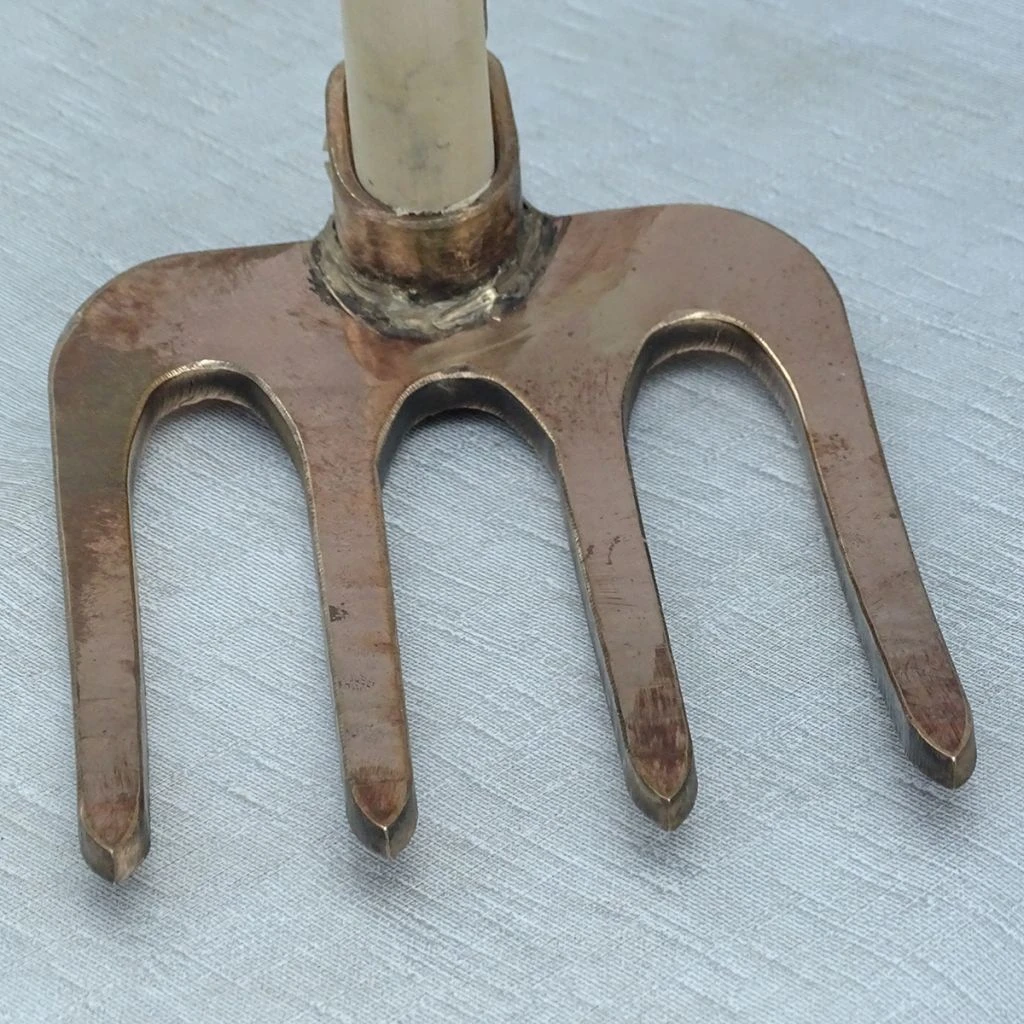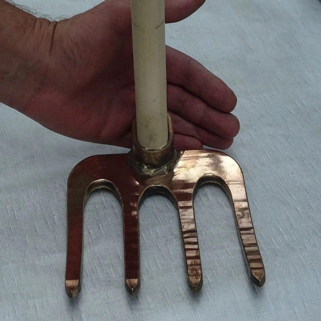 Le croc 4 dents en cuivre modèle Merak de la gamme PKS Bronze, marque homonyme du célèbre écologiste et naturaliste autrichien, est un outil de jardin, robuste et maniable, très pratique pour travailler la terre en surface dans les massifs de plantes ou en prévision des semis et des plantations de printemps ou d’automne. La tête en cuivre qui dépose à l’usage de micro particules dans la terre, contribue à l’amender avec ce constituant naturel du sol. Au moyen des dents en bronze, les légumes à racine peuvent être buttés de manière optimale et douce. Il est extrêmement solide et supporte aussi le piochage dans le sol compact.