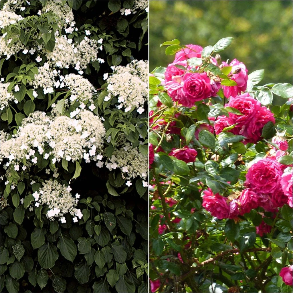 Voici un duo de grimpantes très complémentaires, à placer sur une clôture, un vieil arbre, un mur, une cabane ou toute construction un peu vilaine qu’il métamorphosera : les belles roses à l’ancienne du rosier éclosent parmi les fleurs en dentelle blanche de l’hortensia grimpant en plein cœur de l’été. Le spectacle se prolonge jusqu’en automne, le rosier fleurissant encore parmi les ombelles de son compagnon devenues vertes et brunes. Offrez à votre jardin un décor romantique et peu ordinaire pendant de nombreuses semaines, en mariant ces deux grimpantes sans souci ! Nous vous conseillons d’installer ce duo dans des fosses de plantation séparées, au soleil du matin.