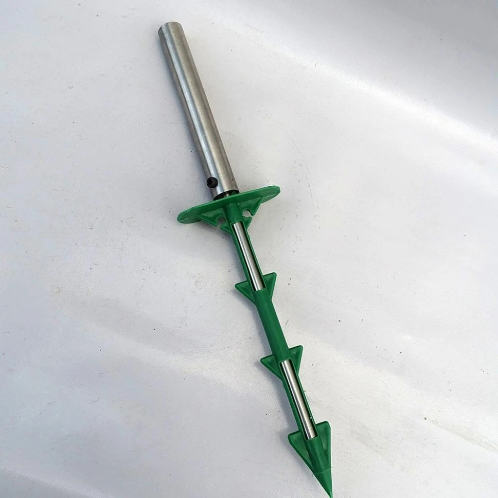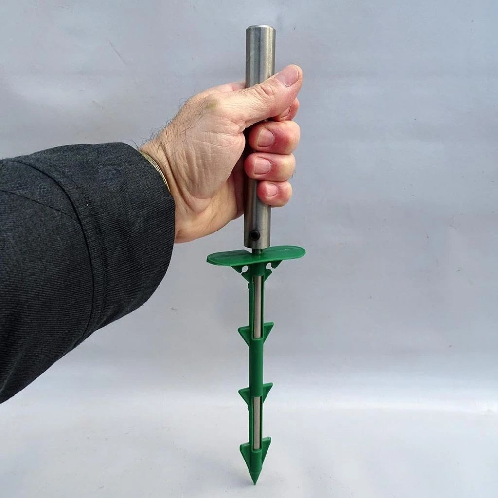 Cet outil à frapper pour pose des clous en polypropylène ou biodégradables a été spécifiquement conçu pour éviter de les casser lors de leur mise en place tout autour des toiles de paillage et autres protections de sol. Insérez la tête du clou dans la partie creuse de l’outil, puis enfoncer le tout à l’aide d’un maillet ou d’un marteau. Libérez l’outil en effectuant une légère rotation.