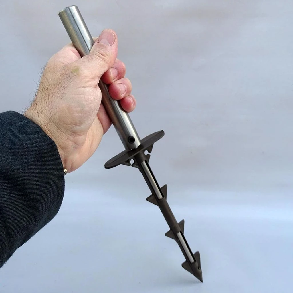 Cet outil a été spécifiquement conçu pour éviter de casser les clous en polypropylène ou biodégradables pour paillages lors de leur mise en place. Insérez la tête du clou dans la partie creuse de l’outil, puis enfoncer le tout à l’aide d’un maillet ou d’un marteau. Libérez l’outil en effectuant une légère rotation.
