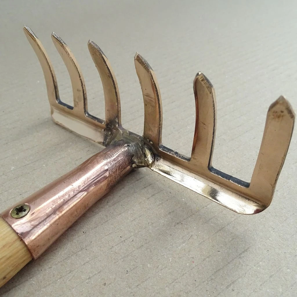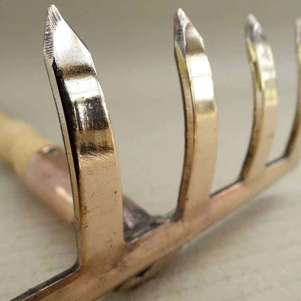 Ce petit râteau à main en cuivre modèle Atik de la gamme PKS Bronze avec son petit manche et sa tête à 6 dents est l’outil parfait pour entretenir vos plantations en pots et vos petits parterres! Muni de 6 dents pointues, larges et courbes, il fonctionne comme un peigne robuste, ramassant efficacement les débris végétaux comme les feuilles mortes, les brindilles issues de taille. Ses dents ameublissent et aérent la terre en surface par griffage et servent dans un deuxième temps, pour niveler et égaliser le sol préparé. Il sert également à briser et démêler les chignons de racines des plantes en pot ou en godet, prêtes à être transplanter. Son manche en hêtre et son poids-plume rend sa prise en main confortable même par temps froid, pour une utilisation régulière dans le jardin. Garanti 2 ans.