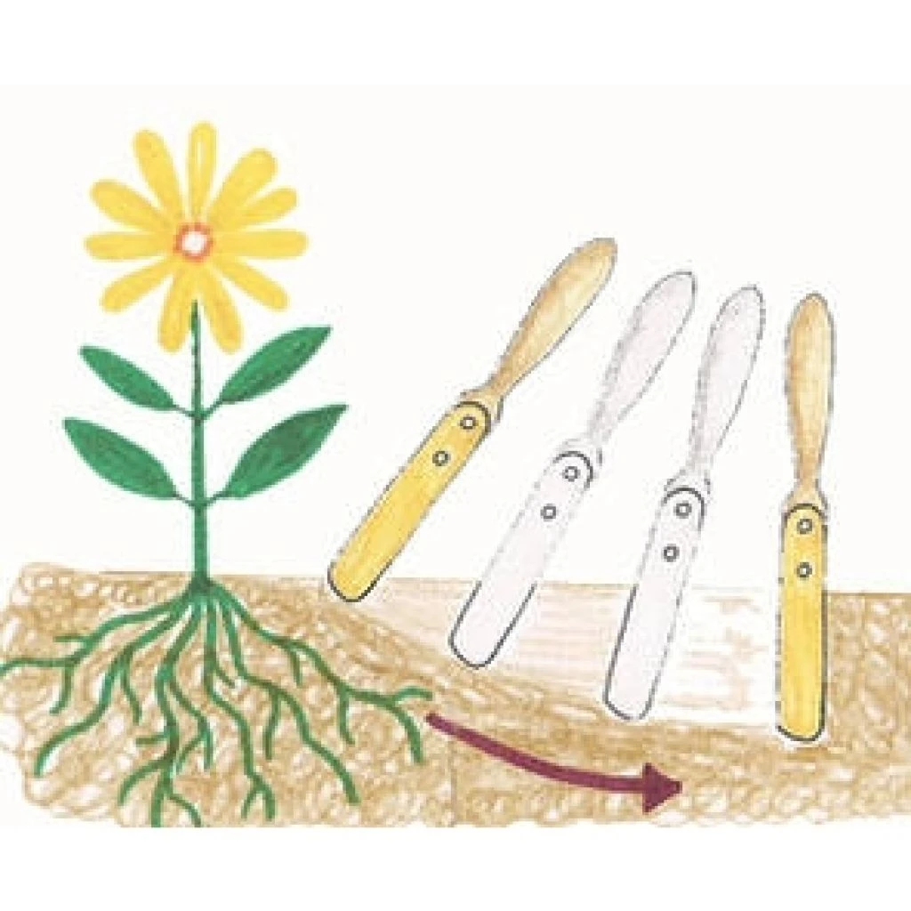 La sarclette s’enfonce dans le sol au niveau du collet de la plante (à la base des feuilles, au niveau du sol), en tirant ou en poussant sur le manche ,la lame double fil tranche les mauvaises herbes.