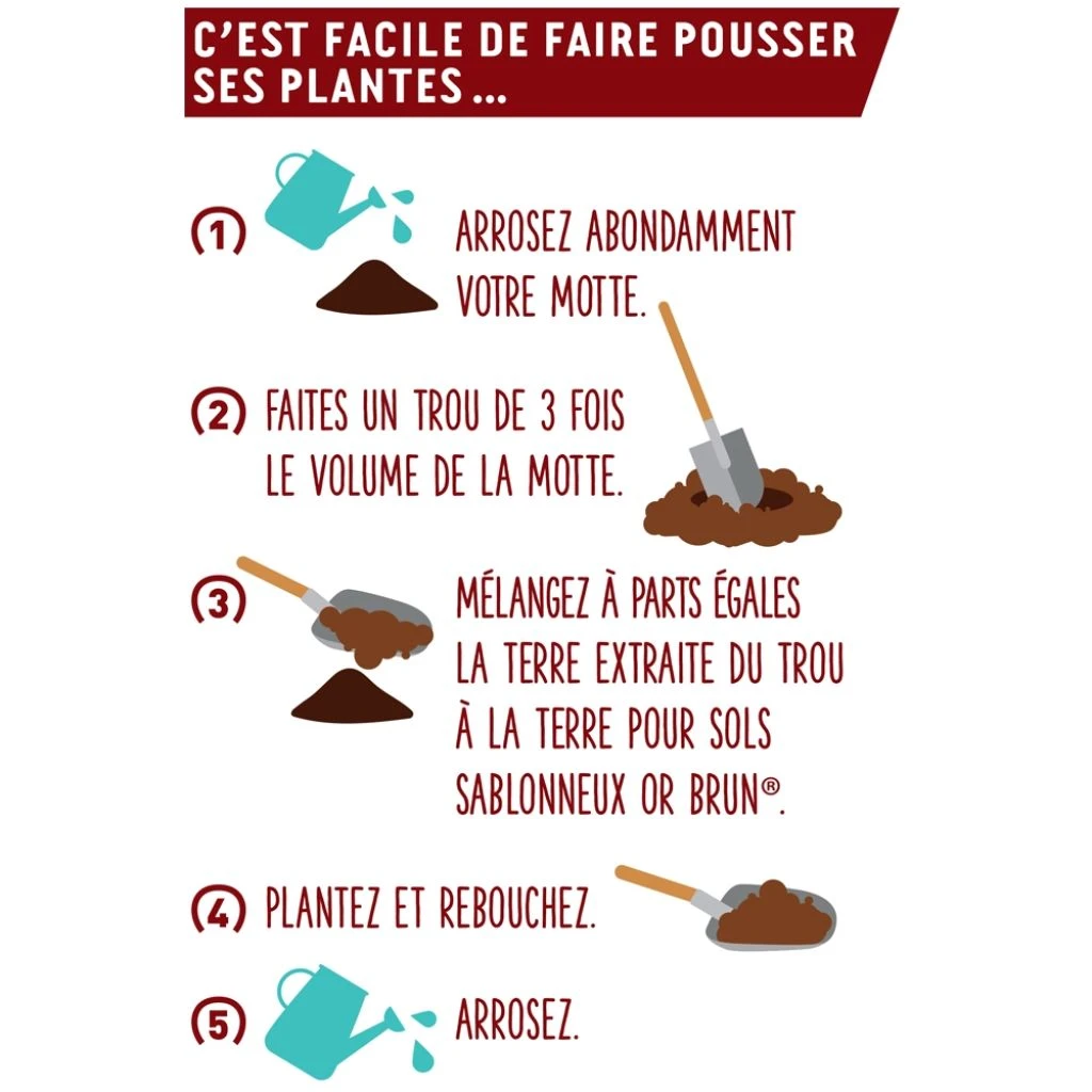 Creuser un trou largement plus grand que votre motte. Mettre de côté la mauvaise terre et la mélanger équitablement avec la Terre pour Sols Sablonneux. Insérer votre motte dans le trou et combler l’espace vide avec le mélange réalisé, puis arroser.